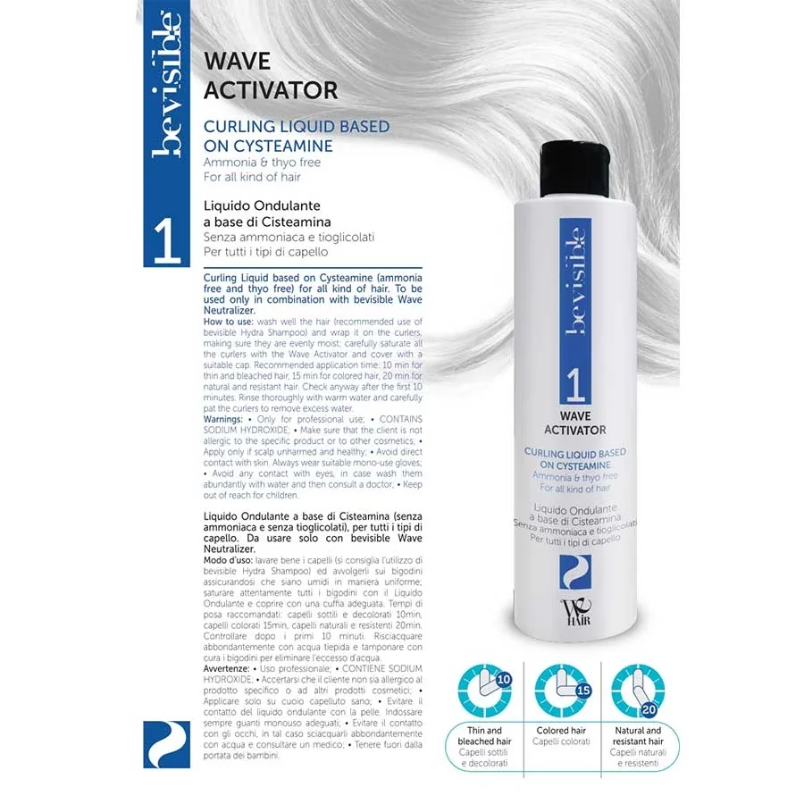 Liquid Cysteamine based Undulating (without ammonia and without thioglycolates), for all hair types. To be used only with Wave Neutralizer Bevisible. Format: Dispenser 250ml.