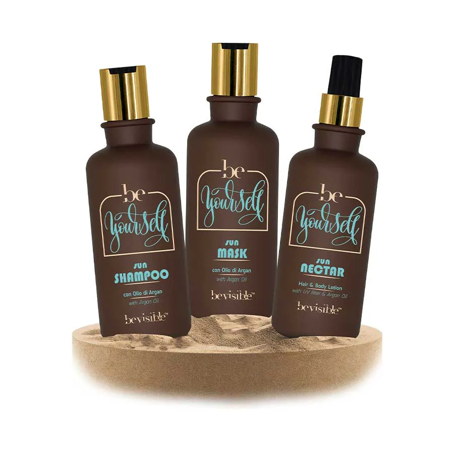 - SUN SHAMPOO (250 ml): detergente protettivo e idratante con Olio di Argan e Aloe Vera. Elimina sale, cloro e residui preservando la naturale morbidezza della chioma.