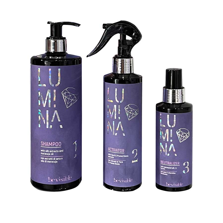agitare bene il prodotto prima dell’uso. Dopo LUMINA SHAMPOO, tamponare leggermente i capelli e distribuire uniformemente circa 30/40 erogazioni di ACTIVATOR. Massaggiare su lunghezze e punte, lasciando in posa il prodotto per circa un minuto. Risciacquare abbondantemente con acqua tiepida. Completare il trattamento con LUMINA NEUTRALIZER.